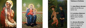 Si l’on doit jouer à l’observateur averti, il nous est permis de remarquer que la tête de la femme n’est pas nue chez ces artistes, même que Marie a cette auréole de lumière qui la caractérise dans l’immatériel. Lorméus Aderson a-t-il voulu bousculer, en forçant une rondeur chez Marie, dans un aplat aux carreaux sans perspective, même s’il lui impose des seins pieux visibles que par la courbe sur un seul côté du manteau bleu. La ligne droite de la robe en haut des seins trahit son erreur. On reconnaît l’éloquence de Jean-René Jérôme quand il soigne la fleur du mouchoir, dans une violence chromatique pour bien situer l’esprit des vêtements en lambeau qui dévoilent une grâce féminine tellement exquise et des côtes surélevées. Mais on reprochera à l’esprit Bromfay d’enlever toute sa dignité à la femme quand il tombe dans le piège du détail. Où sont les vêtements éparpillés de la femme livrée à la douleur, tandis qu’il accorde malgré tout à l’homme cet espace de pudeur.
