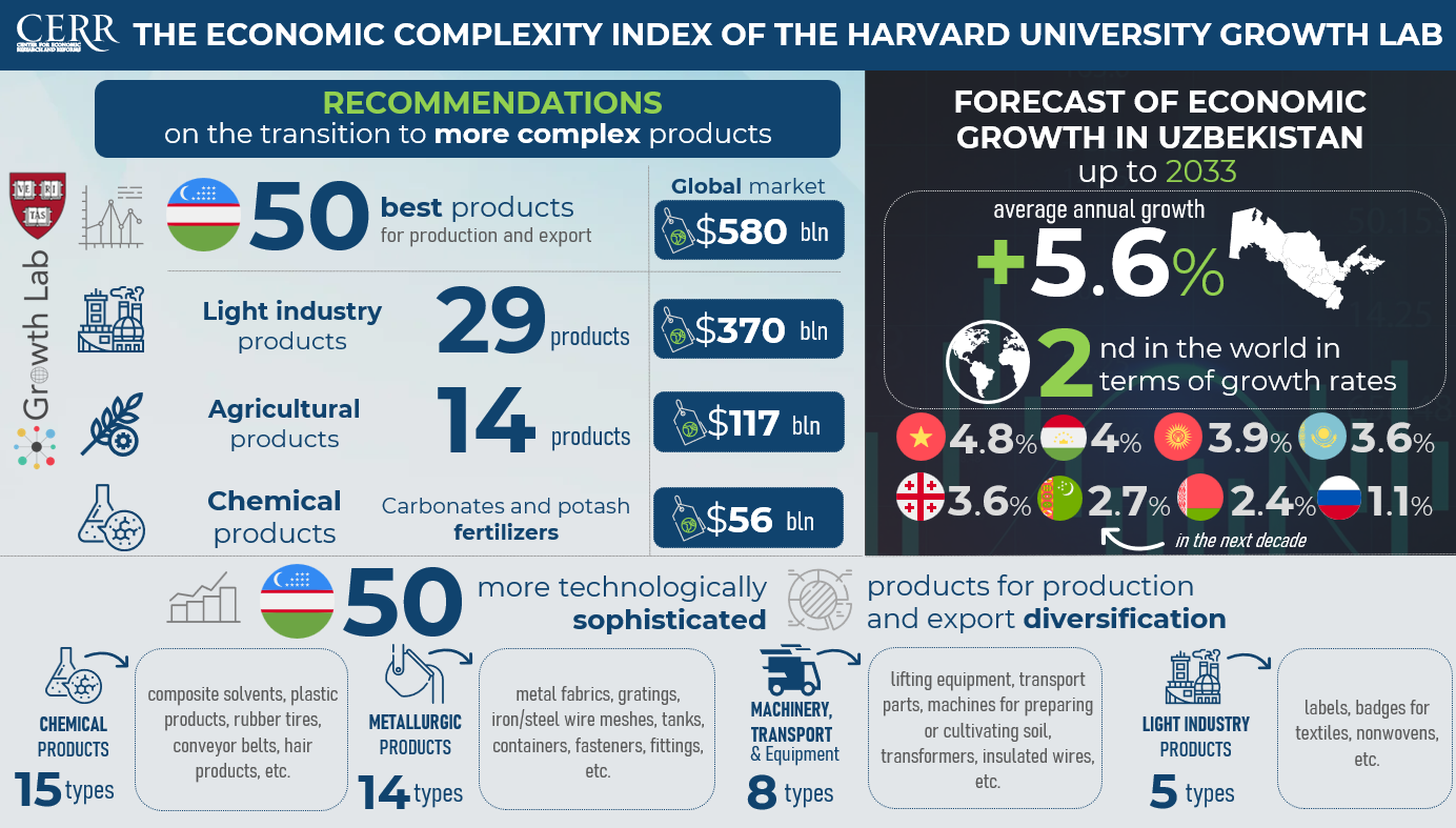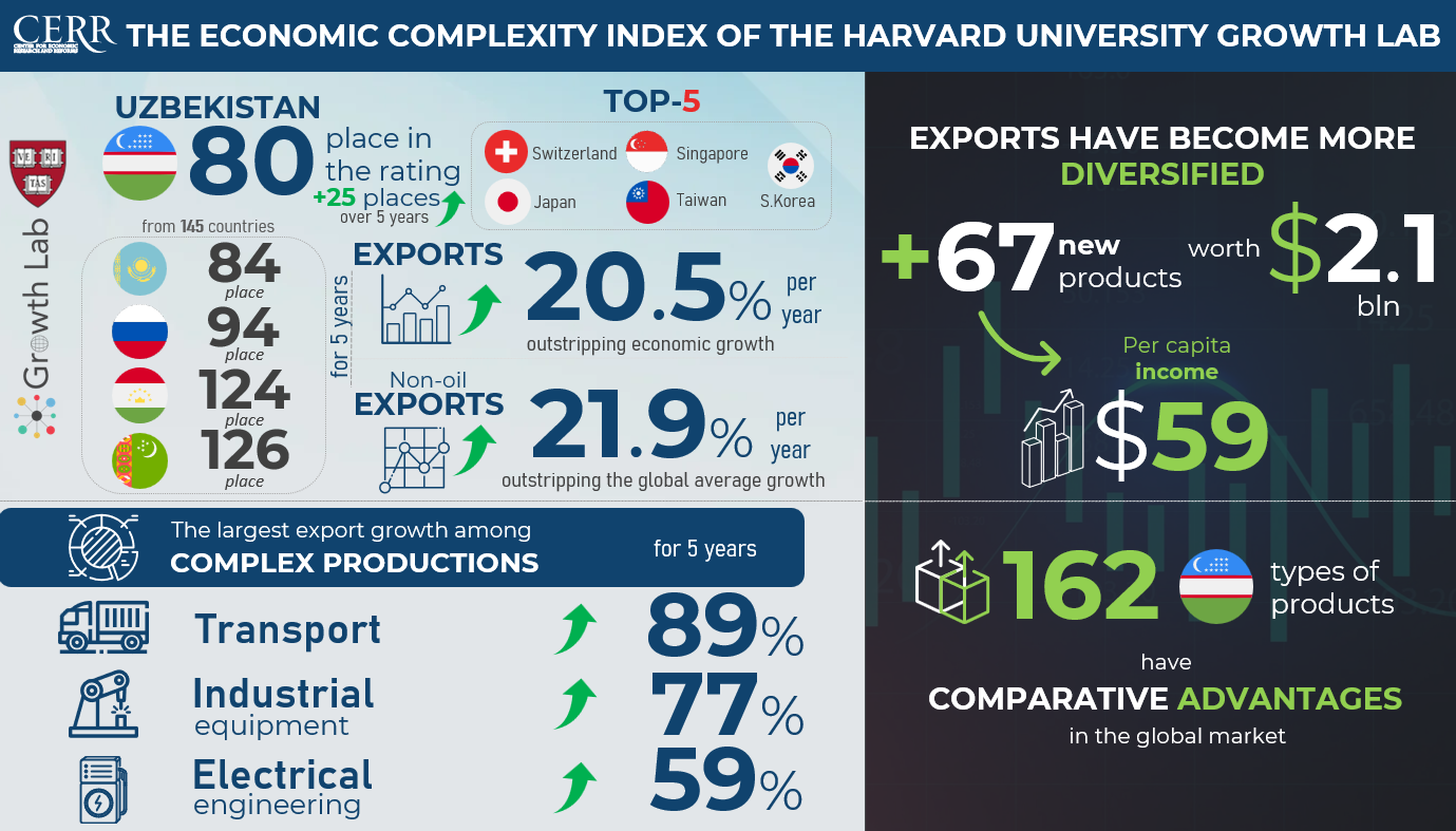 Harvard Growth Lab: Uzbekistan climbs 25 positions in Economic Complexity Index in 5 years The Center for Economic Research and Reforms (CERR) has conducted an analysis of the Economic Complexity Index (ECI) published by the Growth Lab at Harvard University. According to the results, Uzbekistan’s economy has been growing steadily, with exports increasing by an average of 20.5% per year - well above the growth rates of other countries in the region.