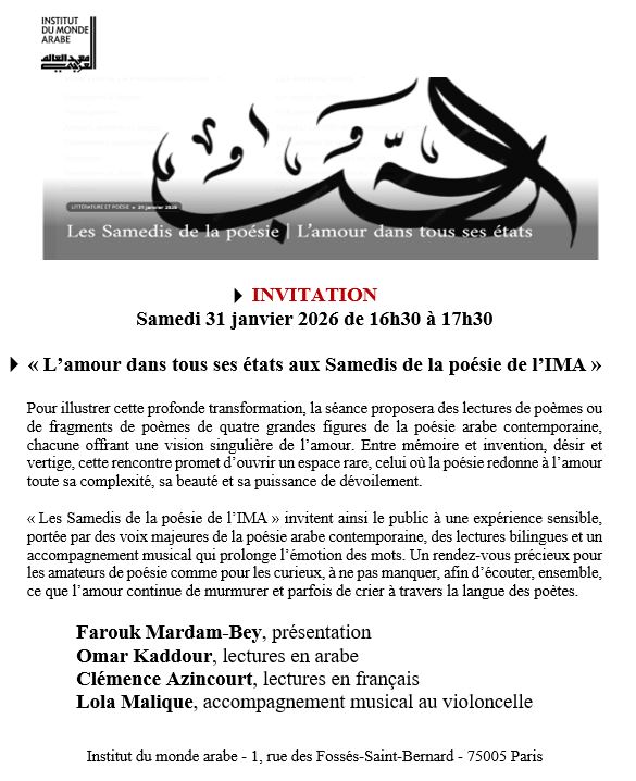 Lectures en arabe et en français, présence musicale du violoncelle, circulation entre les langues et les émotions : cette rencontre se présente comme une expérience poétique à part entière. Entre mémoire et invention, désir et vertige, « Les Samedis de la poésie de l’IMA » invitent le public à écouter ce que l’amour continue de dire et parfois de crier dans la langue des poètes arabes contemporains. Un rendez-vous rare, à la croisée des cultures, destiné aussi bien aux passionnés de littérature qu’à celles et ceux qui souhaitent découvrir la poésie comme un art vivant, ouvert sur le monde.