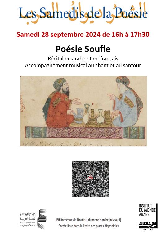 Avec un programme riche en lectures, chants et musiques, ces « Samedis » promettent d’enrichir le dialogue entre les cultures. Un pont entre les mots et les mondes. Cette édition de rentrée puisera au riche corpus de la poésie soufie, avec un choix de poèmes d’Al Hallaj, Ibn al Farid et Ibn Arabi, précédés par une évocation de la première grande figure féminine de la mystique musulmane, Rabia al Adawiya et accompagnés d’éblouissants textes en prose d’Al Niffari.