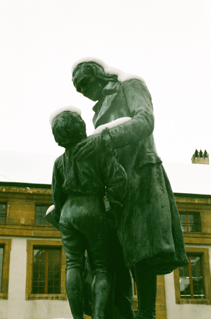 Né à Zurich en 1746, Johann Heinrich Pestalozzi, orphelin de père à 6 ans, est très vite sensibilisé aux injustices sociales. Même s’il peut suivre de très bonnes études dans sa ville natale, il les abandonne pour se lancer dans ce qui sera sa vocation : l’éducation pour tous. Son maître à penser, c’est Rousseau, l’auteur de l’Émile, traité d’éducation qu’il lira à l’âge de 16 ans et qu’il suivra à la lettre pour éduquer son propre fils (ce qui ne s’avérera d’ailleurs pas très heureux).